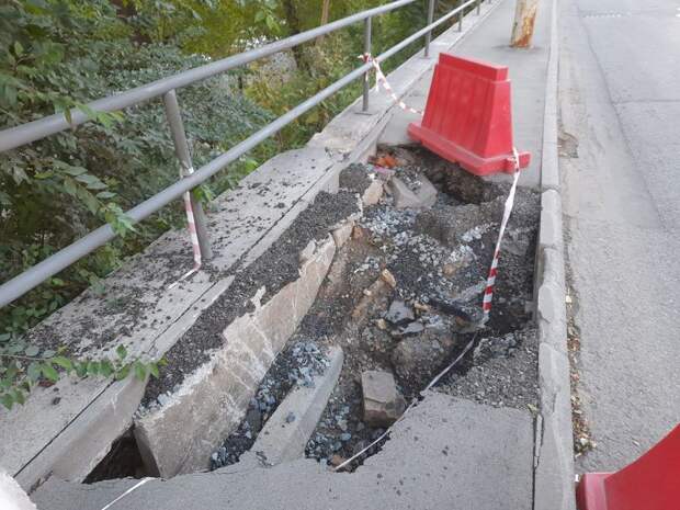 К августу он разросся в огромную дыру, огороженную пластиковыми блоками. Остатки тротуара держатся на ржавых столбах и растущем рядом с ними деревом.Как сообщалось в начале августа, этот участок тротуара значился в городских планах на ремонт до середины сентября. Тем не менее, его начали ремонтировать уже в августе, засыпали щебнем и землёй, подготовили к асфальтированию. Но выполненные работы не выдержали испытания дождём — вода полностью размыла все труды дорожников, яма увеличилась втрое, пешеходная дорожка полностью разрушилась.