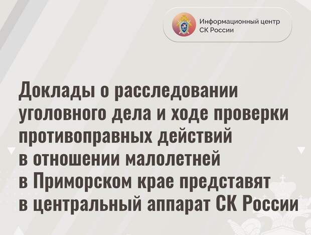 Согласно официальному заявлению СУ СК России по Приморскому краю, мать «незаконно вывезла девочку из реабилитационного центра, не уведомив персонал учреждения о своих действиях» (в реальности – она забрала ребёнка из школы).«Ребёнок был помещен в специализированное учреждение из-за ненадлежащих условий проживания и препятствования расследованию дела о противоправных действиях отчима», – разъяснили в ведомстве.